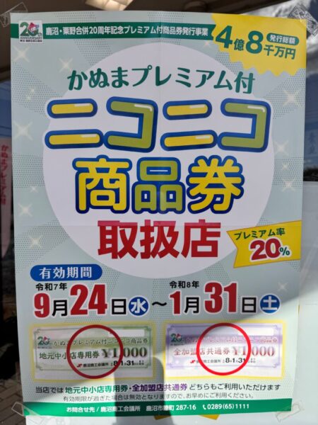 当店は、かぬまプレミアム付きニコニコ商品券の取扱店です😊 お買い物の有効期限が令和8年1月31日(土)までとなっております。 どちらもご利用いただけます! まだお使いでない方は、期限切れにご注意ください😌